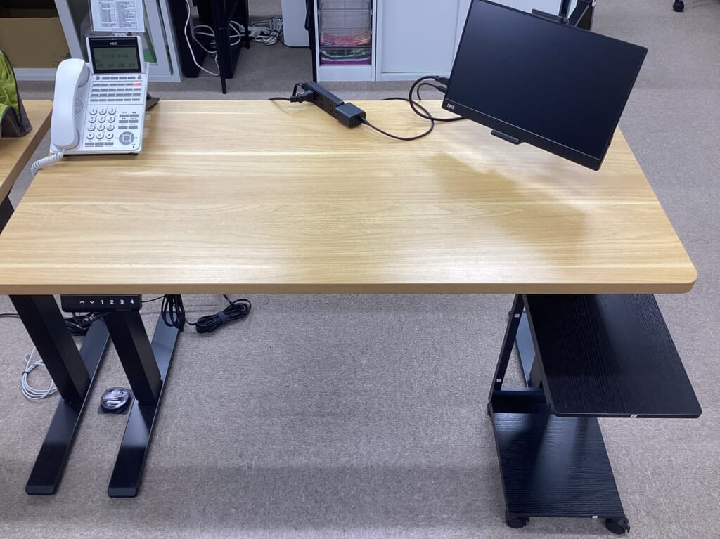これを選んだ理由はシンプルで、スタッフが座るだけでなく、立って仕事もできるようにしたかったからです。ボタン一つでスムーズに高さを変えられるので、集中が途切れることもありません。「少し疲れたな」と感じた時に、気軽に立ち上がって姿勢を変えるだけで、良い気分転換になります。