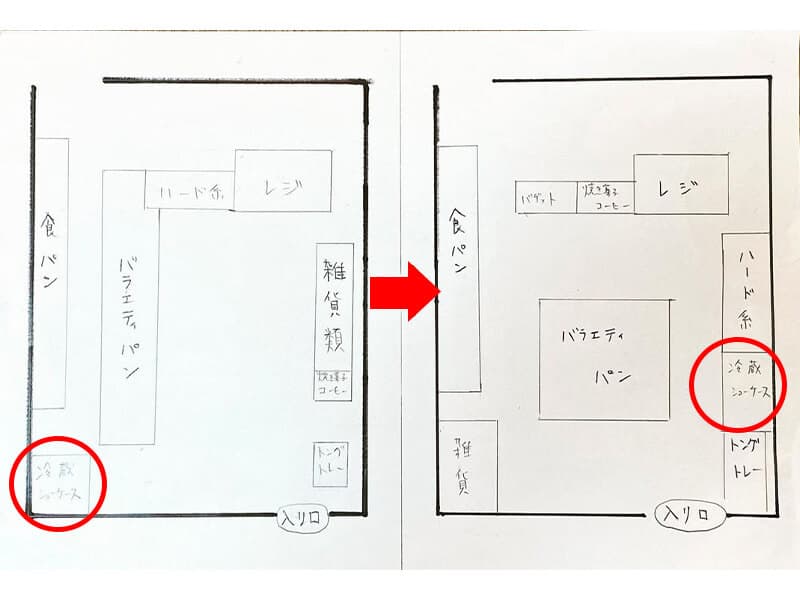 いろんなパンがトレイに乗った状態で最終的に冷蔵ショーケースの前に行くのと最初に冷蔵ショーケースがあるのでは手の伸ばしやすさが格段に違います。